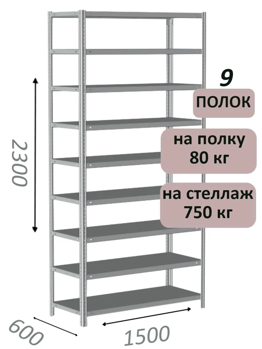 Стеллаж металлический полочный МС-750 2300х1500х600, 9 полок, светло-серый