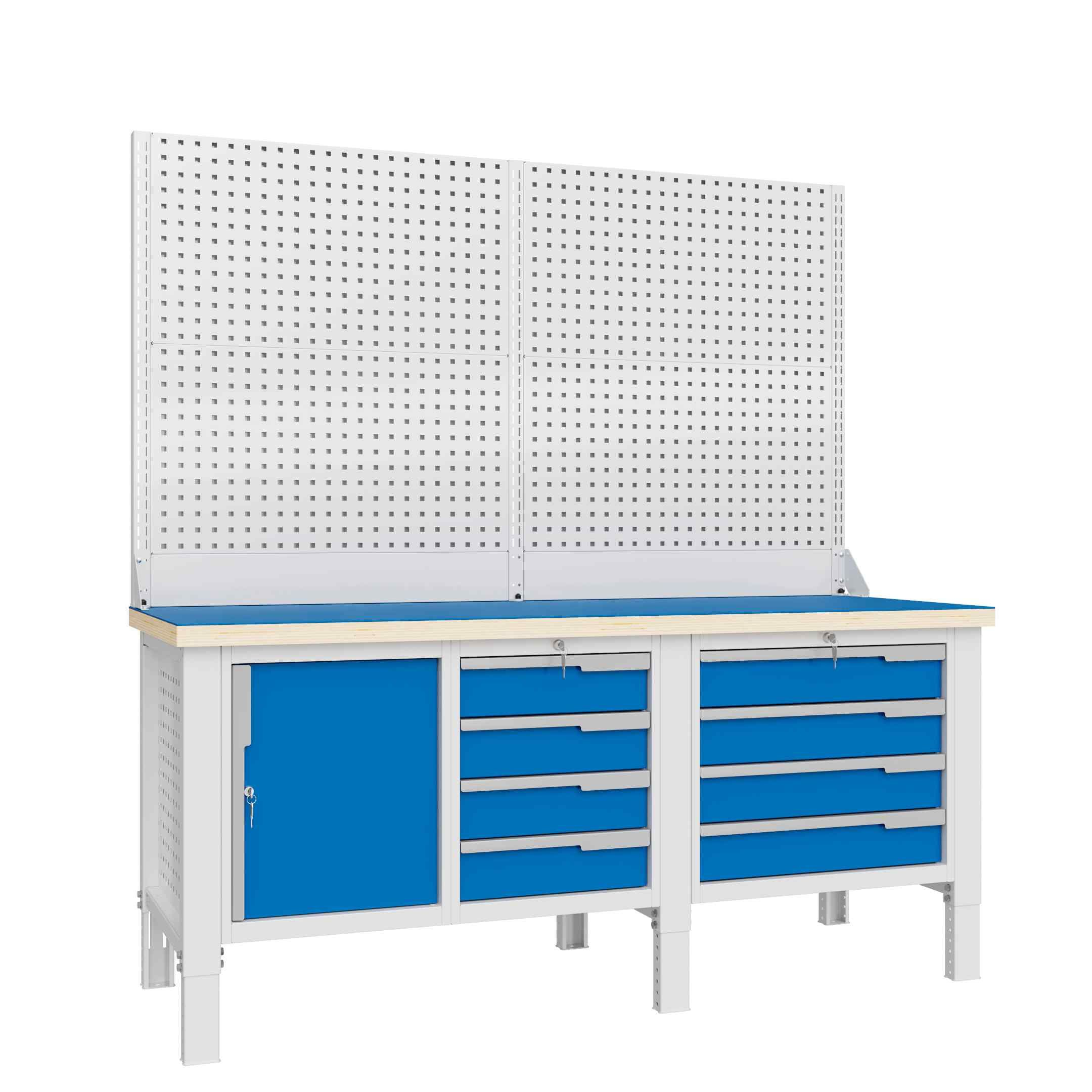 Регулировка рабочего места по высоте осуществляется в диапазоне от 700 до 950мм с шагом 25мм. Предусмотрена возможность тонкой регулировки усиленным резьбовым подпятником. Нагрузка на ящики верстака - до 40 кг, на полки - до 60кг. Общая распределенная нагрузка на рабочую поверхность 1500кг. Имеет возможность стыковки в единую рабочую поверхность с верстаками серии Constructor