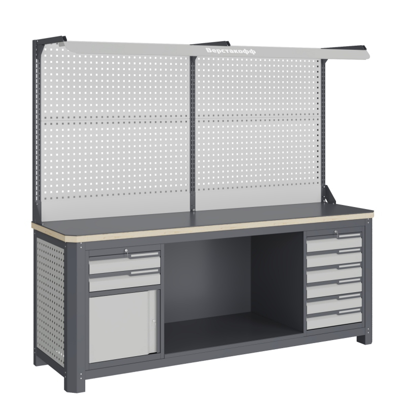 Верстак серии MECHANIC: MCN 2052.S69.11-2F состоит из столешницы шириной 1993 мм, рамы верстака, состоящей из опор, перемычек, боковых перфопанелей, малых модулей S6, S9 и двух комплектов полка-стенка SW1, двойного экрана с кронштейнами с комплектом освещения.