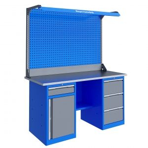 Верстак представляет собой сборно-разборную конструкцию. Верстак комплектуется полкой-стенкой, расположенной под столешницей для удобного размещения габаритного инструмента и оснастки. Все металлические элементы покрыты полиэфирной порошковой краской, обеспечивающей хорошую износостойкость покрытия и невосприимчивость его к моющим средствам и смазочным веществам. Цвет и текстура покрытия корпуса тумб, опор, полки-стенки, экранов и комплектов освещения RAL 5015, гладкая, полуматовая. Цвет и текстура покрытия ящиков и дверок верстака, кронштейнов экранов и косынок RAL 7037, гладкая, глянцевая. Цвет и текстура покрытия накладок ручек ящиков и дверок RAL 9006, гладкая, глянцевая. Столешница состоит из листа влагостойкой фанеры марки ФСФ толщиной 24 мм, которая покрыта лаком-антисептиком и листом оцинкованной холоднокатаной стали толщиной 1,2 мм. Глубина столешниц 696 мм. Максимальная масса груза, равномерно распределенного по столешнице - 1200 кг. Тумбы верстаков выполнены сварными. Ящики в тумбах устанавливаются на шариковых телескопических направляющих полного выдвижения. В тумбе P3 установлено три больших ящика. Внутренние размеры больших ящиков (ВхШхГ), не более: 222 х 397 х 520 мм. Тумбы с ящиками снабжены общим центральным замком с поворотом ригеля 180 градусов и подпружиненной тягой. В тумбе P8 установлен малый ящик и имеется отделение с дверью и одной полкой. Внутренние размеры малых ящиков (ВхШхГ), не более: 103 х 397 х 520 мм. Ящик снабжен центральным замком с поворотом ригеля 180 градусов и подпружиненной тягой. Полка устанавливается на парах специальных формованных зацепов, выполненных в боковых стенках тумбы. Имеется возможность смены стороны открывания двери. Дверь тумбы снабжена центральным замком с поворотом ригеля 180 градусов. В комплекте имеется два ключа с каждым замком. Максимально допустимая масса груза, равномерно распределенного по поверхности любого выдвижного ящика 30 кг (при установке в большой ящик двух пар направляющих 50 кг). Максимальная масса груза, распределенного по поверхности полки и полки стенки - 30 кг. Верстак имеет декларацию соответствия ТР ТС 025/2012 «О безопасности мебельной продукции». Верстак имеет сертификат соответствия ГОСТ Р 58863-2020 «Столы производственные. Верстаки из металла. Общие технические условия». Двойной экран (перфорированные панели) верстака выполнен с квадратной перфорацией 12х12 мм с шагом 38 мм для установки крючков, держателей и других аксессуаров. Экран крепится к столешнице с помощью специальных кронштейнов. Максимальная масса груза, равномерно распределенного по поверхности экрана - 21 кг. Комплект освещения устанавливается над верстаком. В комплекте идет защитный козырек, кронштейны и лампа с магнитными креплениями, которые позволяют менять ее положение.