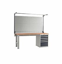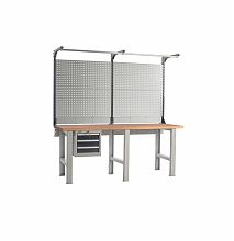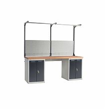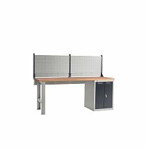 Металлические элементы верстаков окрашены эпоксидной порошковой краской, устойчивой к механическим воздействиям и агрессивным жидкостям. Ящики, дверцы тумб и стойки экрана – цвет антрацитово-серый RAL 7016, остальные элементы – цвет серый RAL 7038.
