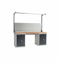Металлические элементы верстаков окрашены эпоксидной порошковой краской, устойчивой к механическим воздействиям и агрессивным жидкостям. Ящики, дверцы тумб и стойки экрана – цвет антрацитово-серый RAL 7016, остальные элементы – цвет серый RAL 7038.